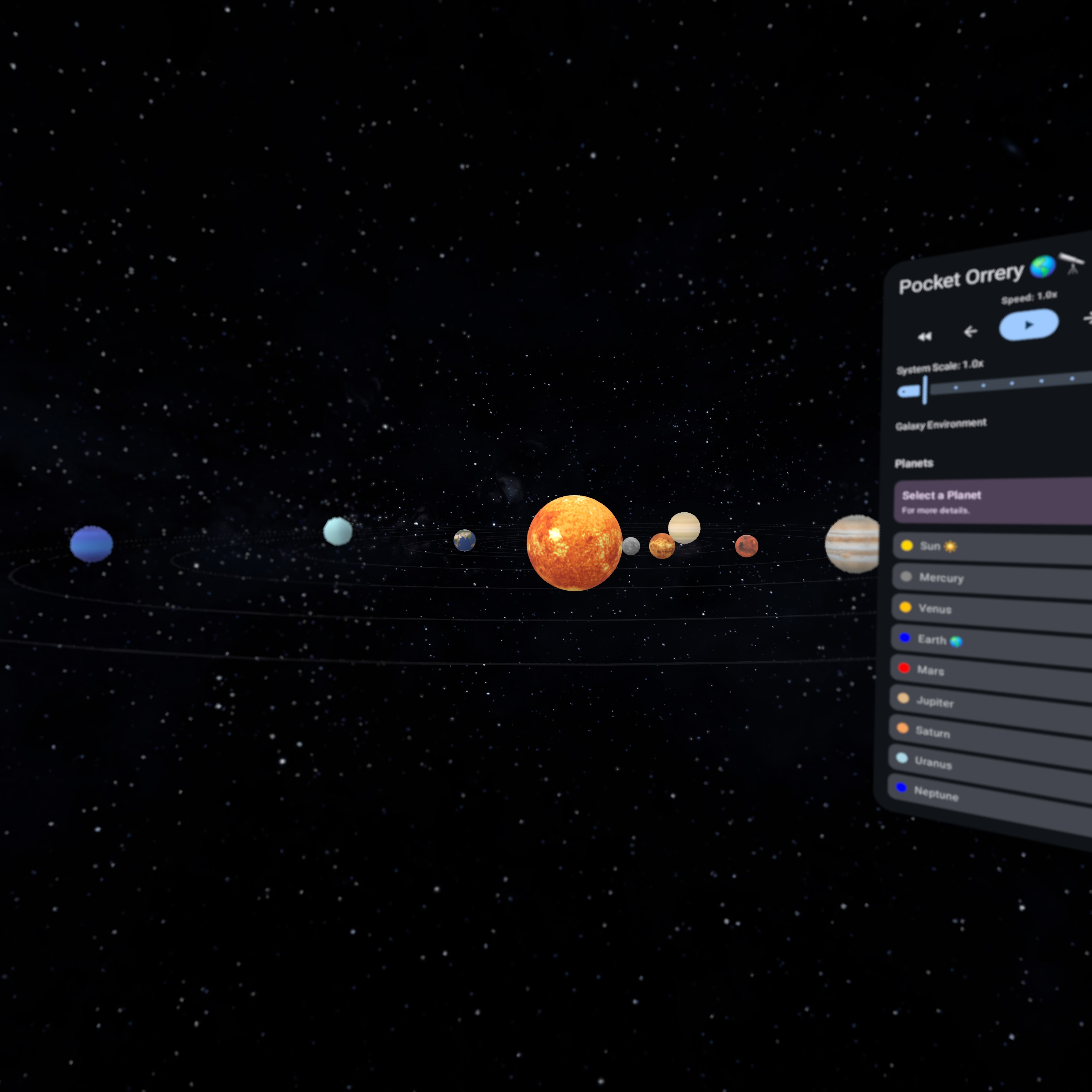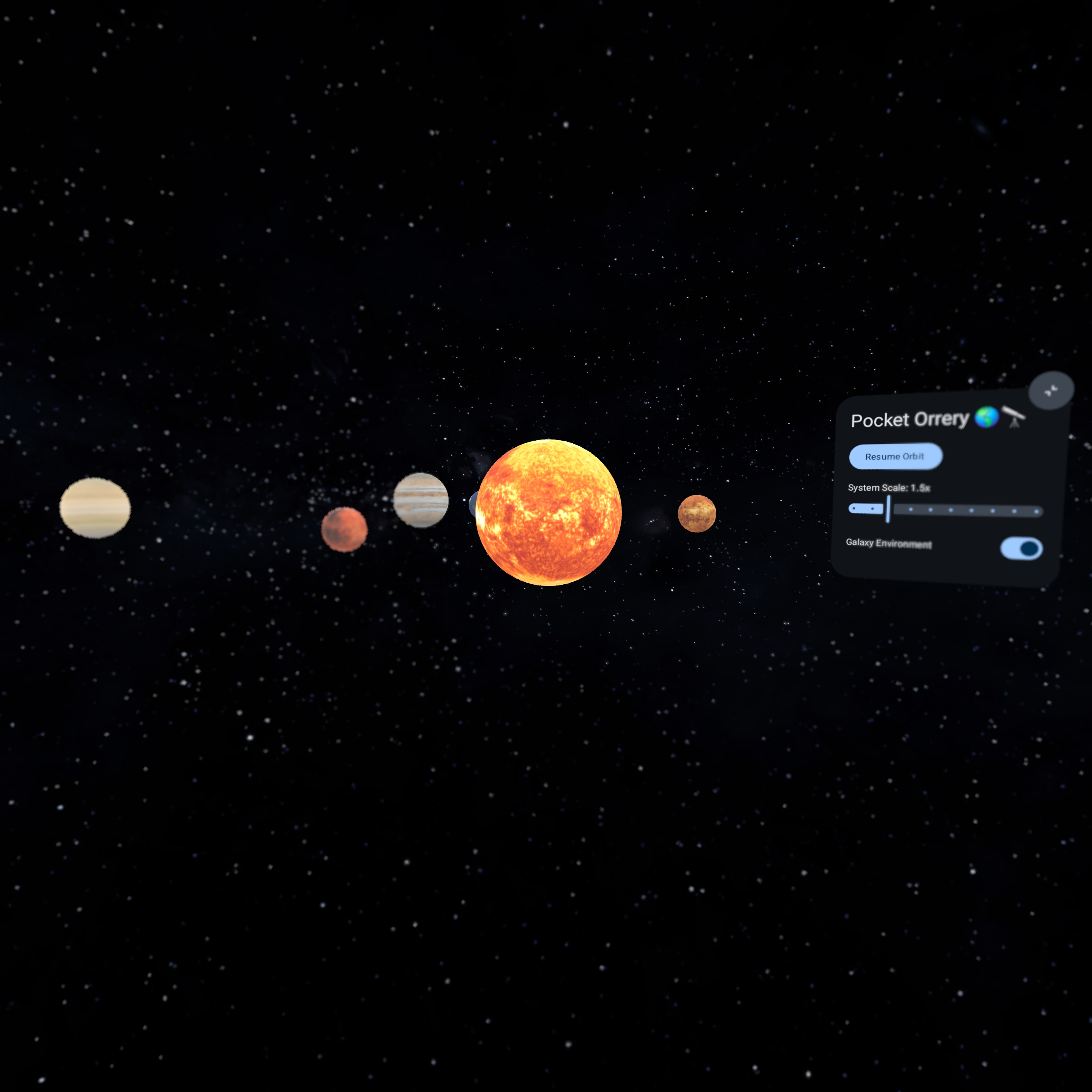 Pocket Orrery XR allows you to bring the solar system into your physical space. You can observe the planets in their orbits, scale the entire system to fit on your desk or fill your room, and learn interesting facts about each celestial body.