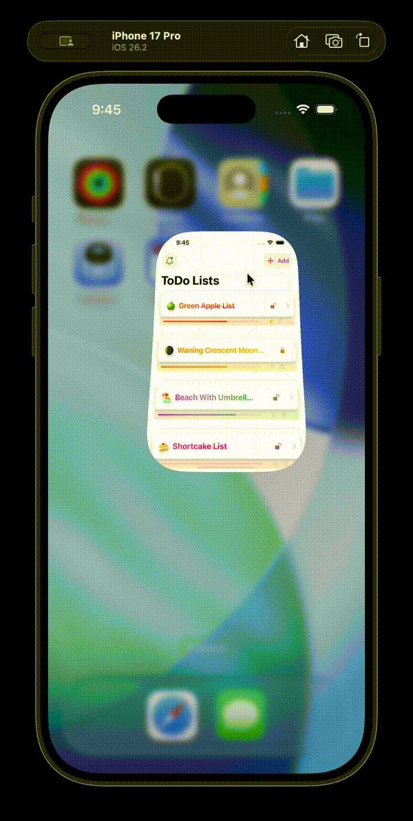 App running on iPhone 17 Pro Simulator with iOS 26 Liquid Glass