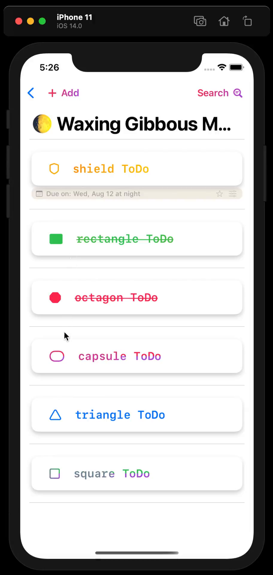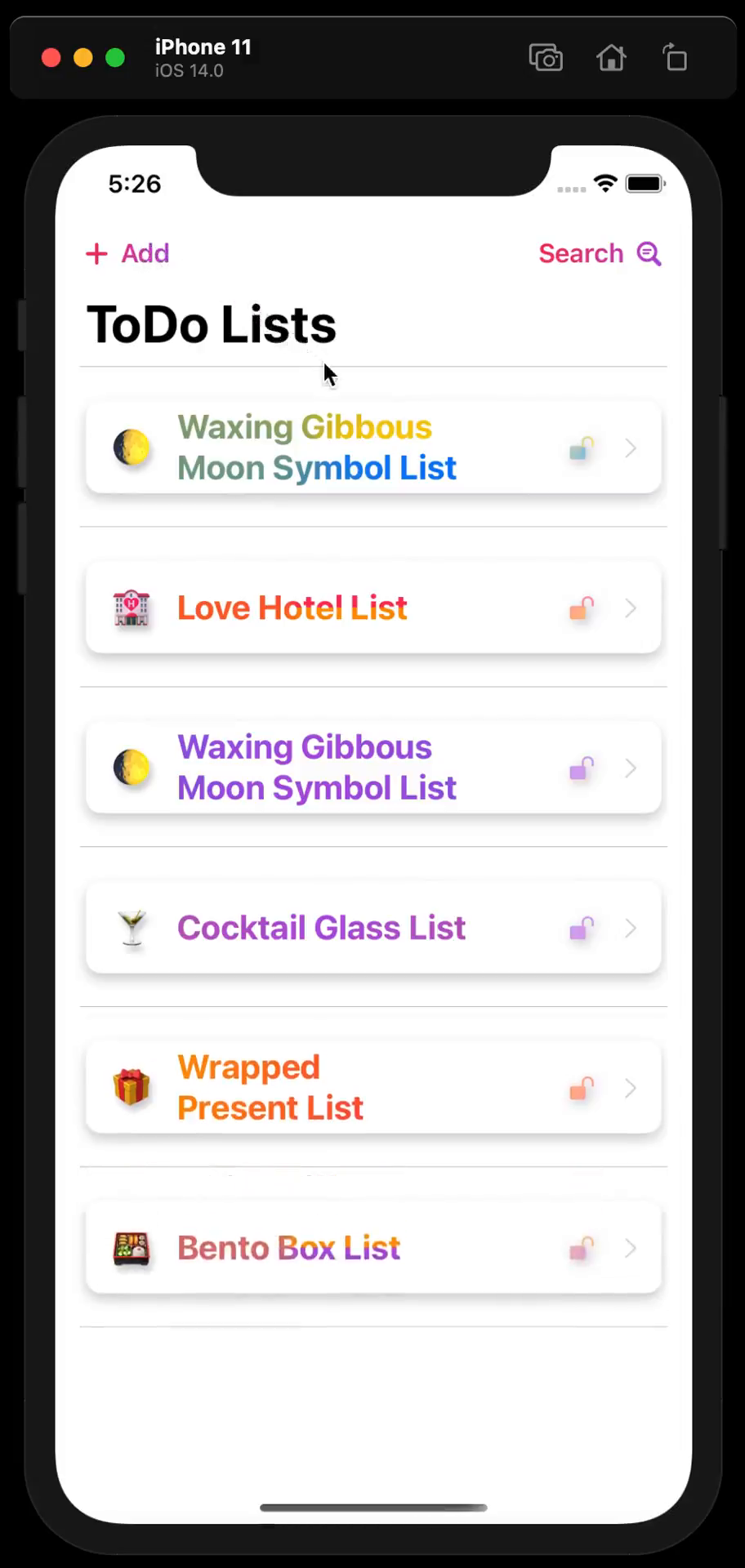 NavigationStack with value-based navigation@Observable and @ObservedObject for state management.searchable modifier for search functionality.toolbar for navigation bar itemsColorPicker for color selectionThis app was originally written by-hand in 2020 targeting iOS 14 using the SwiftUI framework available at that time.