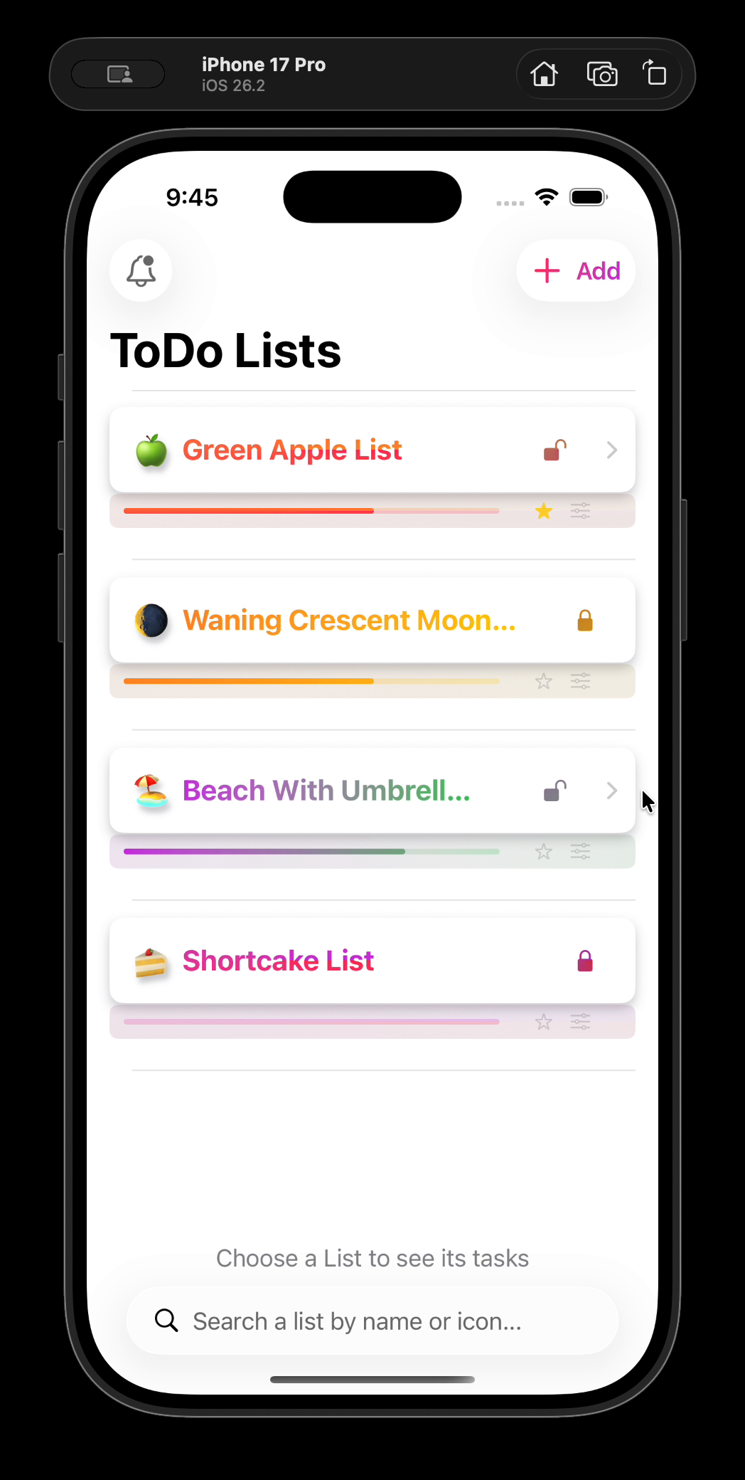 A modern, feature-rich ToDo list app built with SwiftUI featuring beautiful gradient themes, biometric authentication, and a sleek Liquid Glass design.